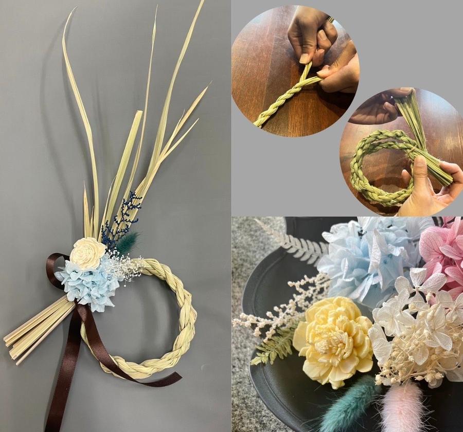 ご自身で綯った真菰にアーティフィシャルフラワーやプリザーブドフラワーの中から、お好きなパーツを選び、世界に一つだけのしめ飾りを制作する体験です。